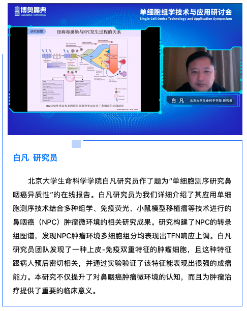2020年10月31日,由生物芯片北京國家工程研究中心、北京博奧晶典生物技術(shù)有限公司主辦的“單細(xì)胞組學(xué)技術(shù)與應(yīng)用研討會(huì)”在北京成功舉辦。在疫情防控新形勢(shì)下,本次大會(huì)以線下現(xiàn)場會(huì)議與線上遠(yuǎn)程會(huì)議相結(jié)合的形式舉辦,打破時(shí)空及地域限制,以更寬更廣的交流平臺(tái),讓全國各地的單細(xì)胞領(lǐng)域?qū)<覍W(xué)者共同見證本次大會(huì)的精彩瞬間。本次會(huì)議線上累計(jì)直播瀏覽量超6000人次,線下100余位嘉賓出席。會(huì)議特采用專業(yè)級(jí)演播大廳進(jìn)行直播報(bào)告,通過5G+4K+AR的創(chuàng)新技術(shù)和高品質(zhì)傳輸進(jìn)行全程實(shí)時(shí)直播,為現(xiàn)場及遠(yuǎn)程參會(huì)代表帶來極好的視聽體驗(yàn)。