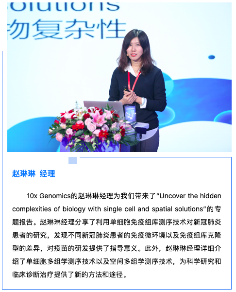 清華大學(xué)醫(yī)學(xué)院研究員、博士生導(dǎo)師,生物芯片北京國家工程研究中心常務(wù)副主任,博奧生物集團(tuán)有限公司高級(jí)副總裁,北京博奧晶典生物技術(shù)有限公司總裁邢婉麗女士為本次會(huì)議進(jìn)行了開幕式致辭。邢婉麗總裁表示單細(xì)胞測(cè)序技術(shù)及空間轉(zhuǎn)錄組技術(shù)在生命科學(xué)和醫(yī)學(xué)研究領(lǐng)域的應(yīng)用日益受到關(guān)注,為高分辨率研究細(xì)胞分群和組織功能研究提供重要的支撐,對(duì)發(fā)現(xiàn)組學(xué)間關(guān)系、記錄動(dòng)態(tài)生物活動(dòng)具有非常重要的意義,為科學(xué)界和醫(yī)學(xué)界更加深入地去認(rèn)識(shí)生命的本質(zhì),解析胚胎發(fā)育過程、腫瘤發(fā)生發(fā)展、新冠肺炎免疫機(jī)制、發(fā)現(xiàn)新的生物標(biāo)志物和治療靶點(diǎn)等提供全新而絢爛的研究視角。邢婉麗總裁對(duì)所有報(bào)告嘉賓及參會(huì)嘉賓的到來表示熱烈歡迎及衷心感謝!