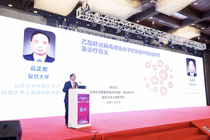 復(fù)旦大學(xué)黨委副書記、復(fù)旦大學(xué)上海醫(yī)學(xué)院黨委書記袁正宏教授作了題為《乙型肝炎病毒感染分子機制的可視化研究及診療意義》的專題報告。報告介紹了研究團隊利用基于 bDNA 的熒光原位雜交結(jié)合免疫熒光技術(shù)及 CRISPR-Tag 活細(xì)胞實時熒光失蹤技術(shù),系統(tǒng)性地建立了在體外細(xì)胞和組織系統(tǒng)進行原位雜交加熒光、顯色檢測HBV核酸和蛋白可視化的方法。通過可視化技術(shù),研究團隊在亞細(xì)胞水平直接觀察到HBV病毒組分,揭示了HBV病毒部分關(guān)鍵復(fù)制環(huán)節(jié)的細(xì)節(jié),填補了HBV生活史一些關(guān)鍵環(huán)節(jié)的時空信息。在組織水平觀察到病毒核酸與蛋白的分布特征,反應(yīng)肝臟內(nèi)HBV病毒的生活特征。課題組開發(fā)的可視化技術(shù)可以用來監(jiān)測慢乙肝患者抗病毒治療后病毒蛋白質(zhì)和核酸,尤其 cccDNA 的清除情況,有助于臨床醫(yī)生制訂更好的治療方案,并可為指導(dǎo)開發(fā)新藥物提供幫助。