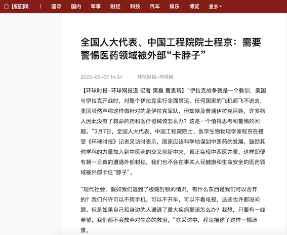 “伊拉克戰(zhàn)爭就是一個教訓(xùn),美國與伊拉克開戰(zhàn)時,對整個伊拉克實行全面禁運,任何國家的飛機都飛不進去,美國雖然聲稱這樣做針對的是伊拉克軍隊,但卻殃及普通伊拉克百姓,許多病人因此沒有了救命的藥和醫(yī)療器械該怎么辦?這是一個值得思考和警惕的問題。”3月7日,全國人大代表,中國工程院院士、醫(yī)學(xué)生物物理學(xué)家程京在接受《環(huán)球時報》記者采訪時表示,國家應(yīng)該科學(xué)地謀劃中醫(yī)藥的發(fā)展,鼓勵其他學(xué)科的力量加入到中醫(yī)藥的交叉創(chuàng)新中來,真正實現(xiàn)中西醫(yī)并重,這樣即便有朝一日真的遭遇外部封鎖,我們也不會在事關(guān)人民健康和生命安全的醫(yī)藥領(lǐng)域被外部卡住“脖子”。