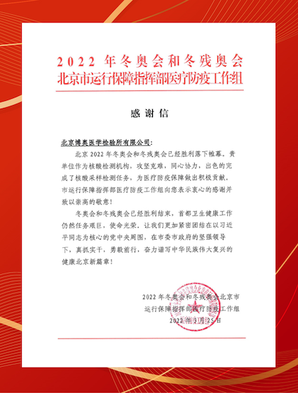 作為戰(zhàn)疫國家隊成員,在此次北京冬奧會和冬殘奧會期間,博奧晶典承擔(dān)了為來自世界各地的國家元首、政府首腦、王室成員和國際組織負責(zé)人等重要來賓提供實時就地核酸檢測以及人員和環(huán)境樣本的核酸檢測任務(wù),以硬核“芯”科技賦能奧運,收獲了來自冬奧會和冬殘奧會北京市運行保障指揮部醫(yī)療防疫工作組的感謝、表揚和點贊。
