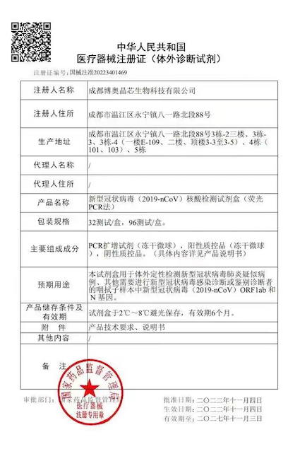 2022年11月4日,博奧晶典新冠病毒核酸檢測整體解決方案再添新成果,凍干型高靈敏度的新型冠狀病毒(2019-nCoV)核酸檢測試劑盒 (熒光PCR法)正式獲得醫(yī)療器械注冊證(國械注準:20223401469)。這是國家藥品監(jiān)督管理局審批通過的首個凍干型新冠病毒核酸檢測試劑盒,同時具備中國NMPA和歐洲CE“雙證”,為堅持“動態(tài)清零”,全面加強常態(tài)化疫情防控能力建設提供全新戰(zhàn)疫利器。