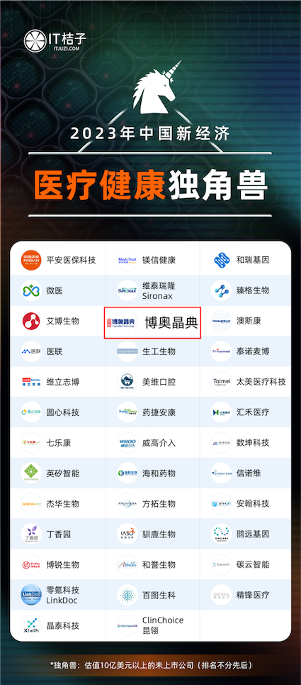 1月18日,新經(jīng)濟創(chuàng)投數(shù)據(jù)服務(wù)商 IT 桔子正式發(fā)布《2023年中國新經(jīng)濟獨角獸企業(yè)》系列重磅榜單。博奧晶典憑借在醫(yī)療健康領(lǐng)域的持續(xù)深耕及領(lǐng)先行業(yè)的卓越創(chuàng)新能力,榮登2023年中國新經(jīng)濟榜單,再獲行業(yè)權(quán)威認(rèn)可。