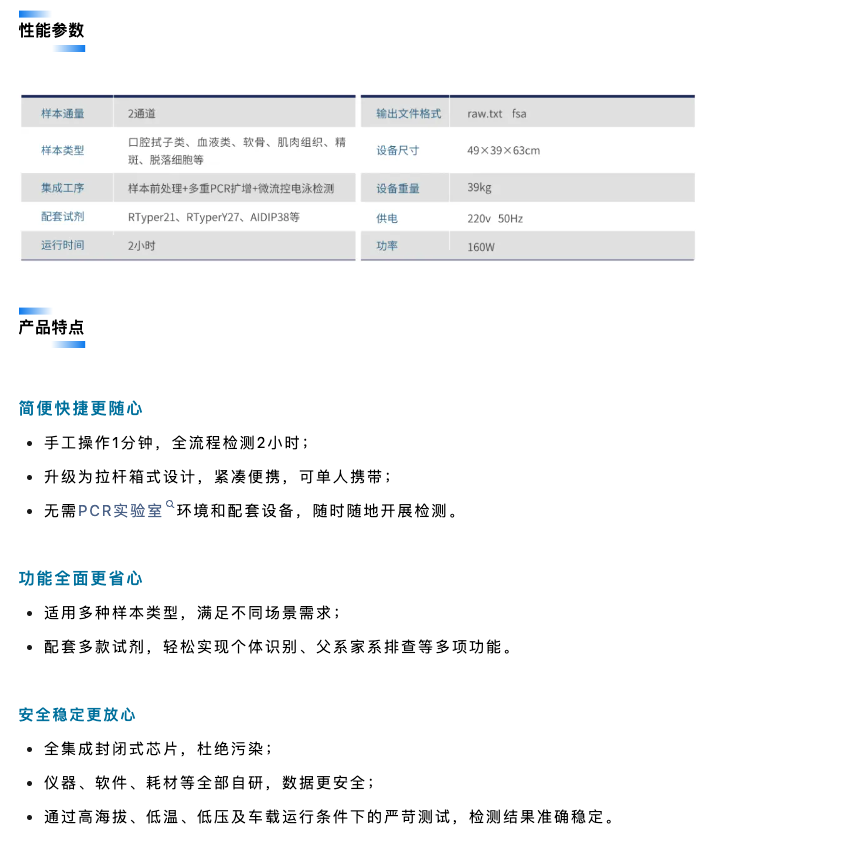 該設備采用拉桿箱式設計,可由單人攜帶使用,適用于戶外、車載、高原環(huán)境等,是國際首款“可移動法醫(yī)DNA實驗室”,為全球公共安全部門在現(xiàn)場物證檢驗,重點人員篩查、重大公共安全事件的快速處置、出入境邊防檢查等應用場景增添強勁利器。